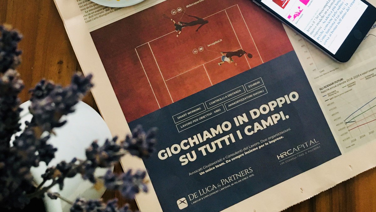 Nous avons intitulé notre campagne de publicité 2020 « Jouons en double sur tous les terrains ». Après « Oui, nous pensons seulement au travail », notre cabinet revient vers la communication, avec une importante nouveauté. À une période où les entreprises se trouvent à devoir relever des défis toujours plus importants, nous présentons notre équipe au complet : une équipe unique qui ne comprend pas seulement les avocats spécialistes de droit social de De Luca & Partners, mais également les consultants en ressources humaines de sa filiale HR Capital S.r.l..